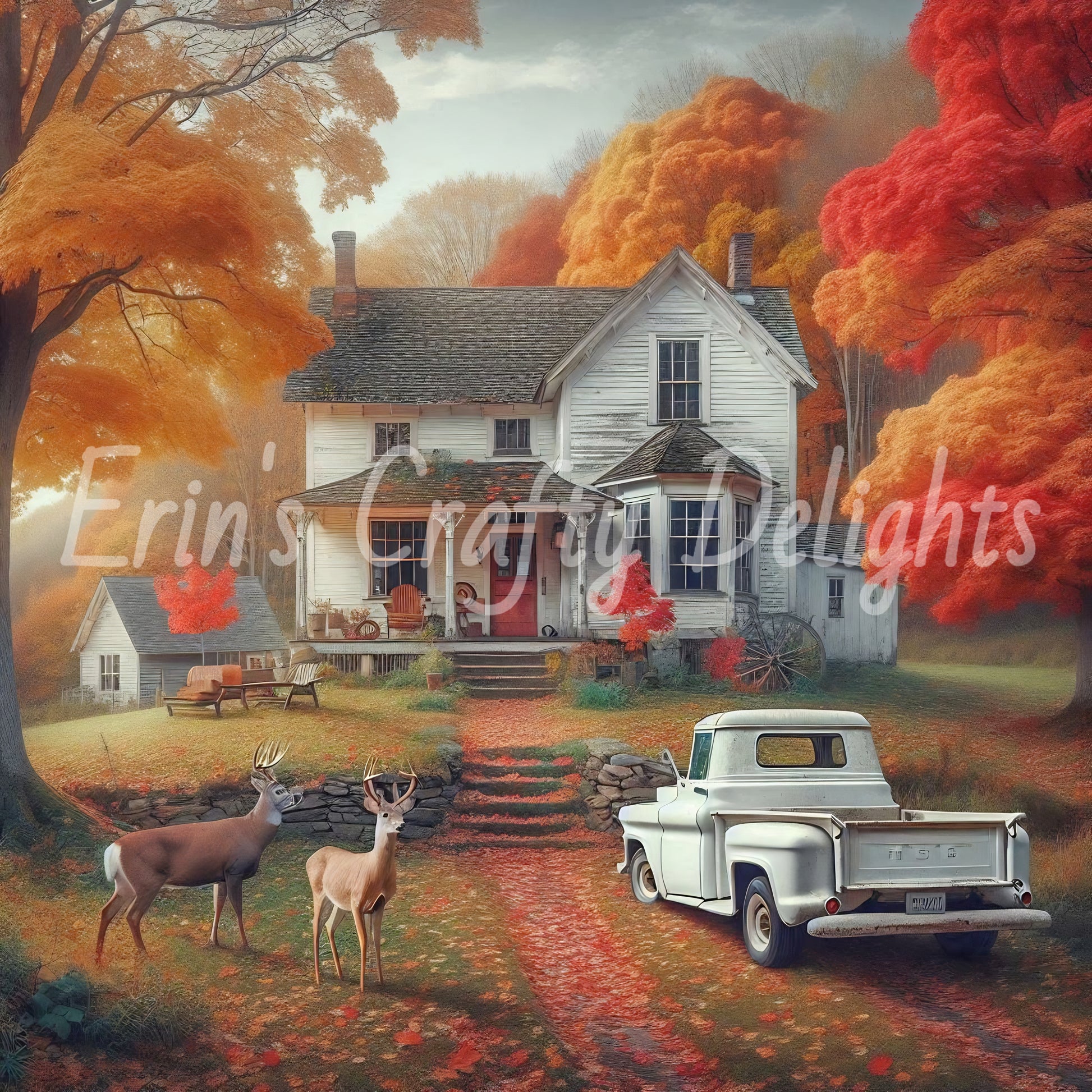 2 Autumn White Truck and Farmhouse
