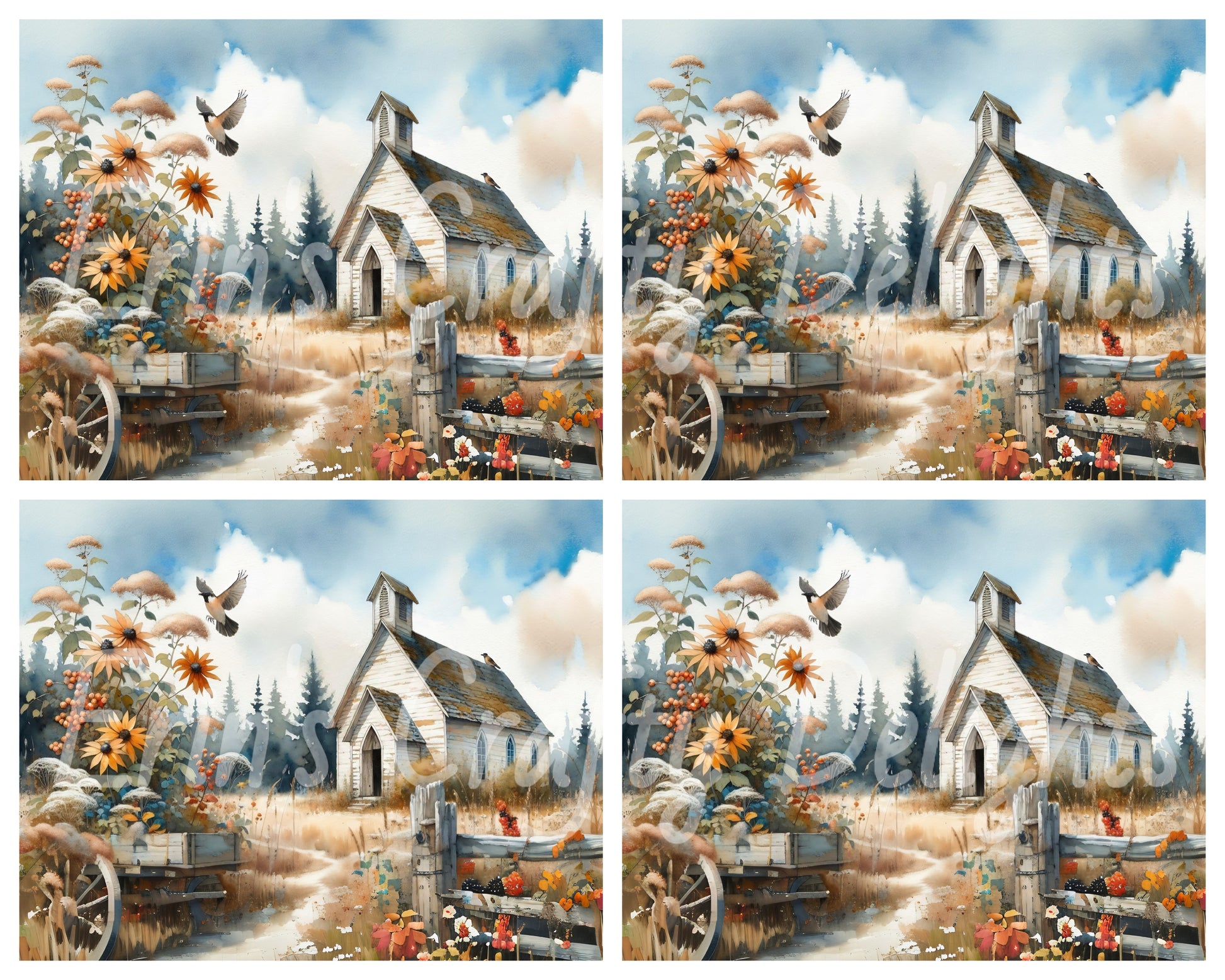 Sweet little churches in the woods. Comes with 4 - 4x6, 8x10 L sizes.