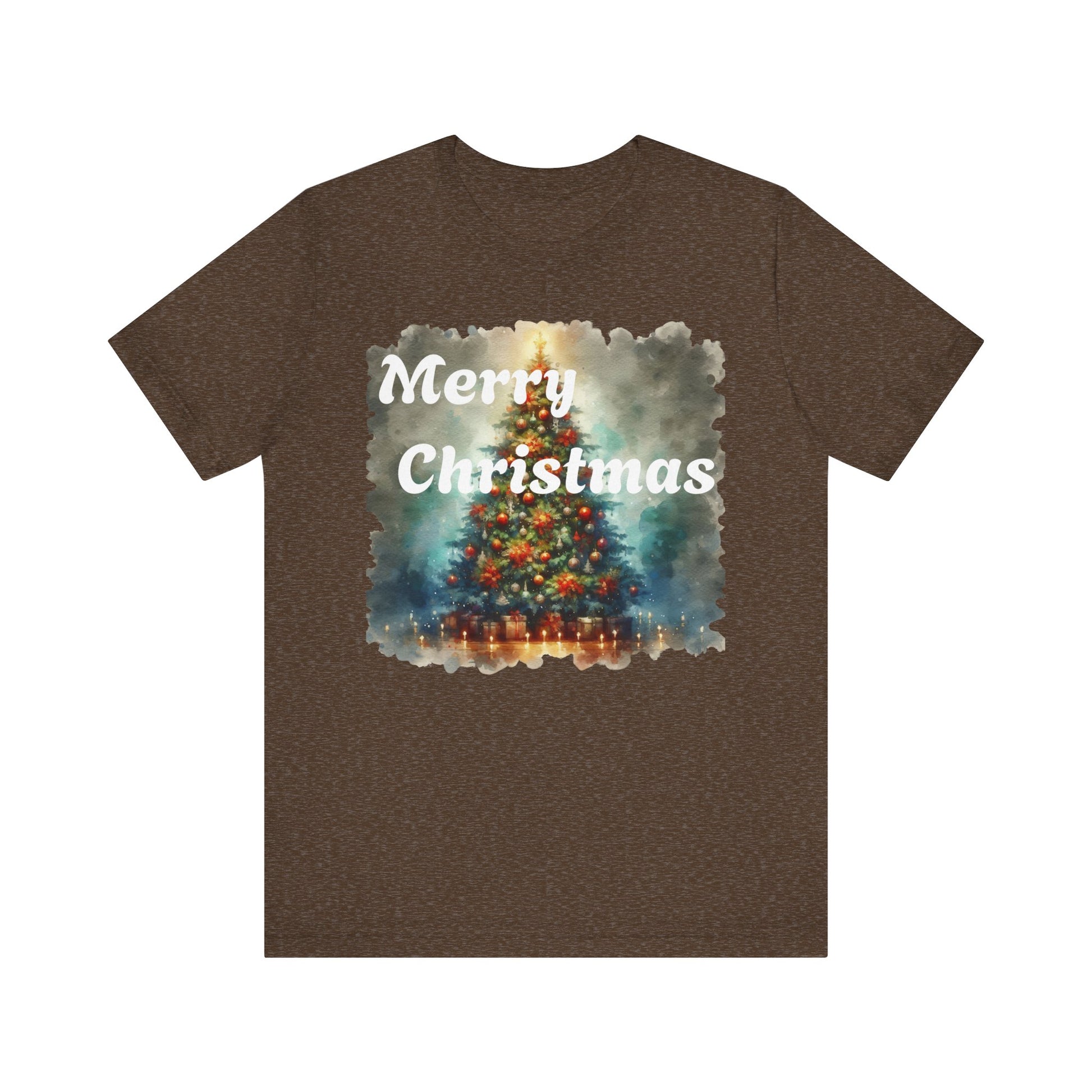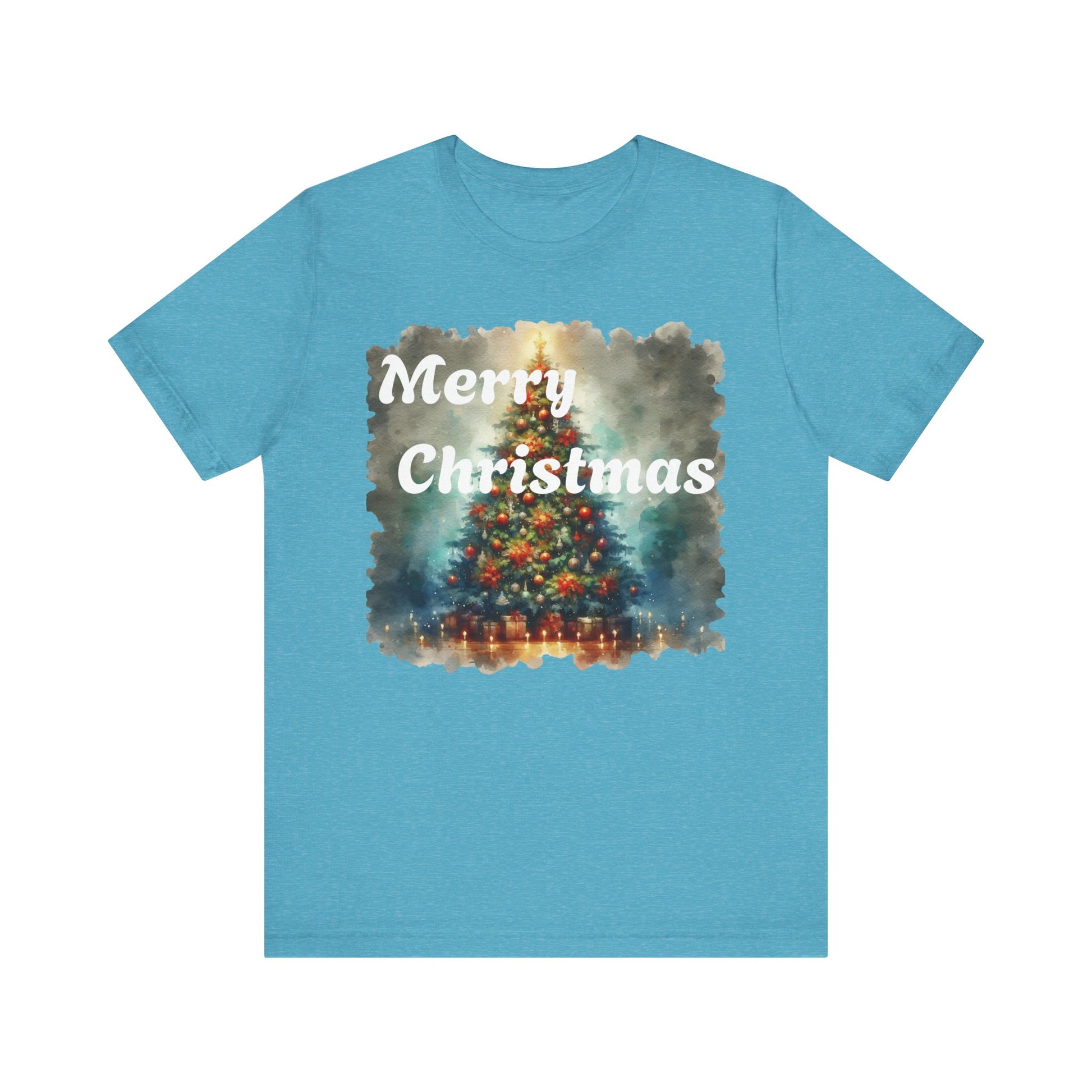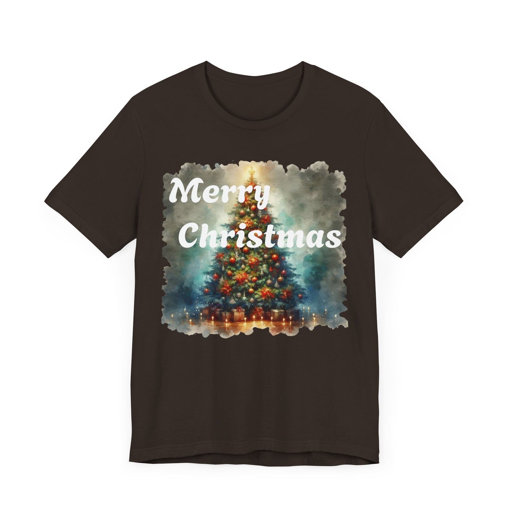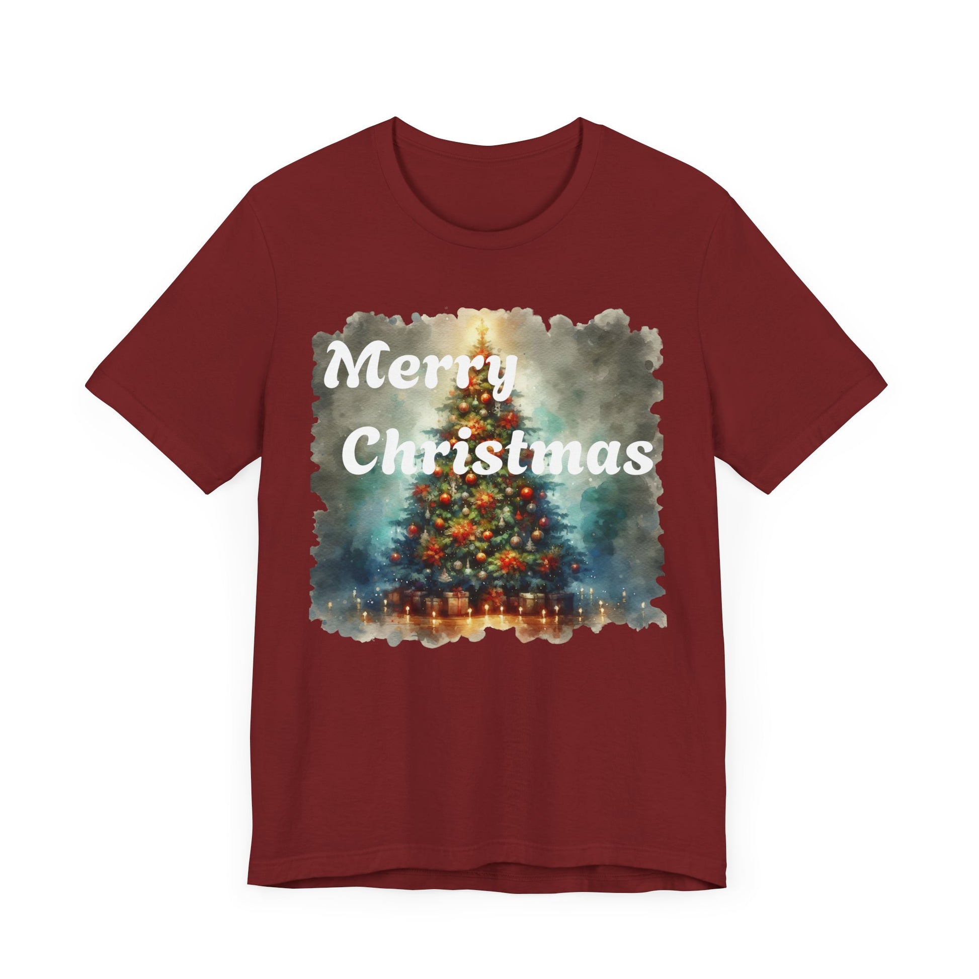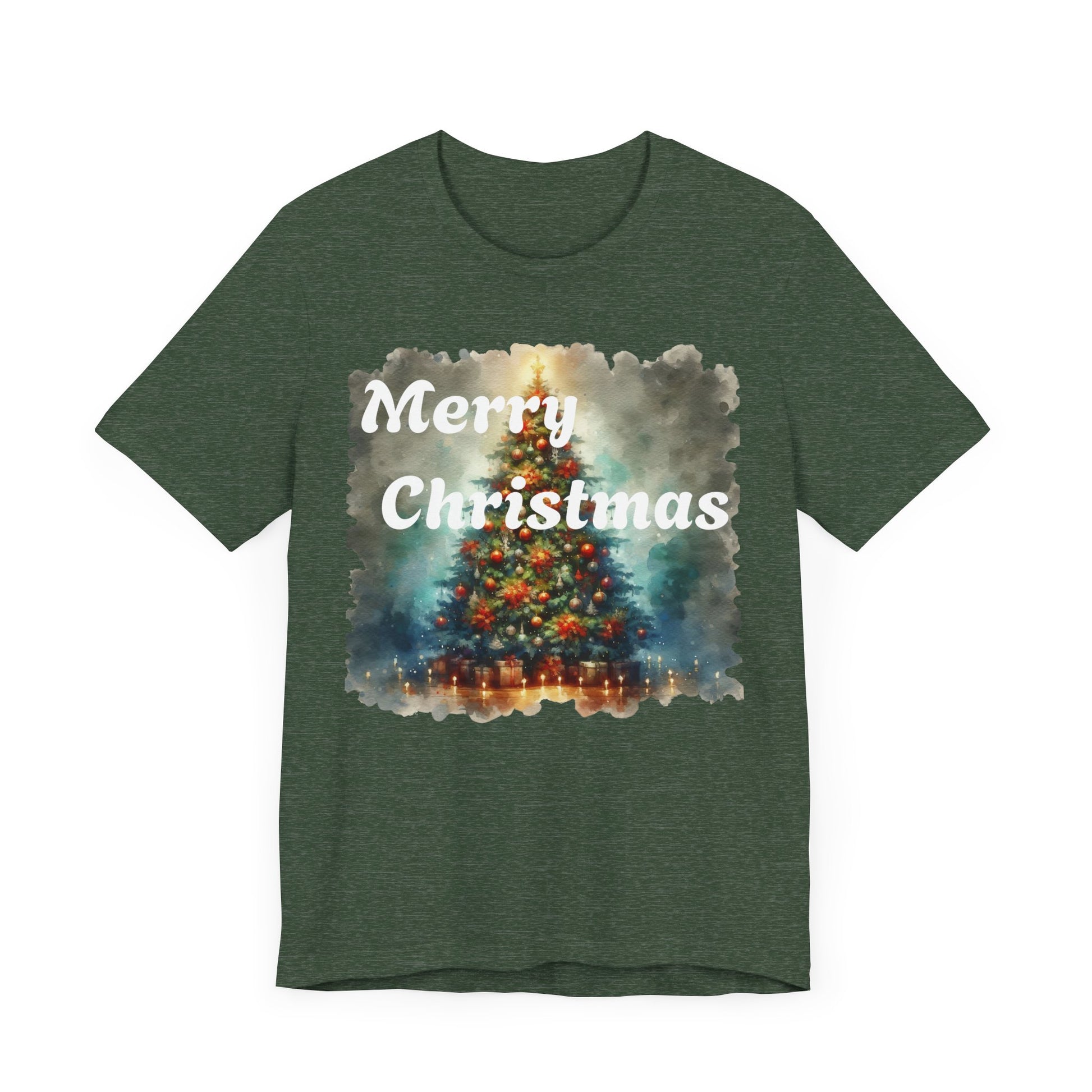 A Merry Christmas-themed T-Shirt featuring a Christmas tree design. This T-Shirt gives off a festive and joyful vibe, perfect for celebrating the holiday season. Ideal for both men and women who want to add a touch of Christmas spirit to their wardrobe. Relevant for Christmas celebrations and holiday gatherings.
