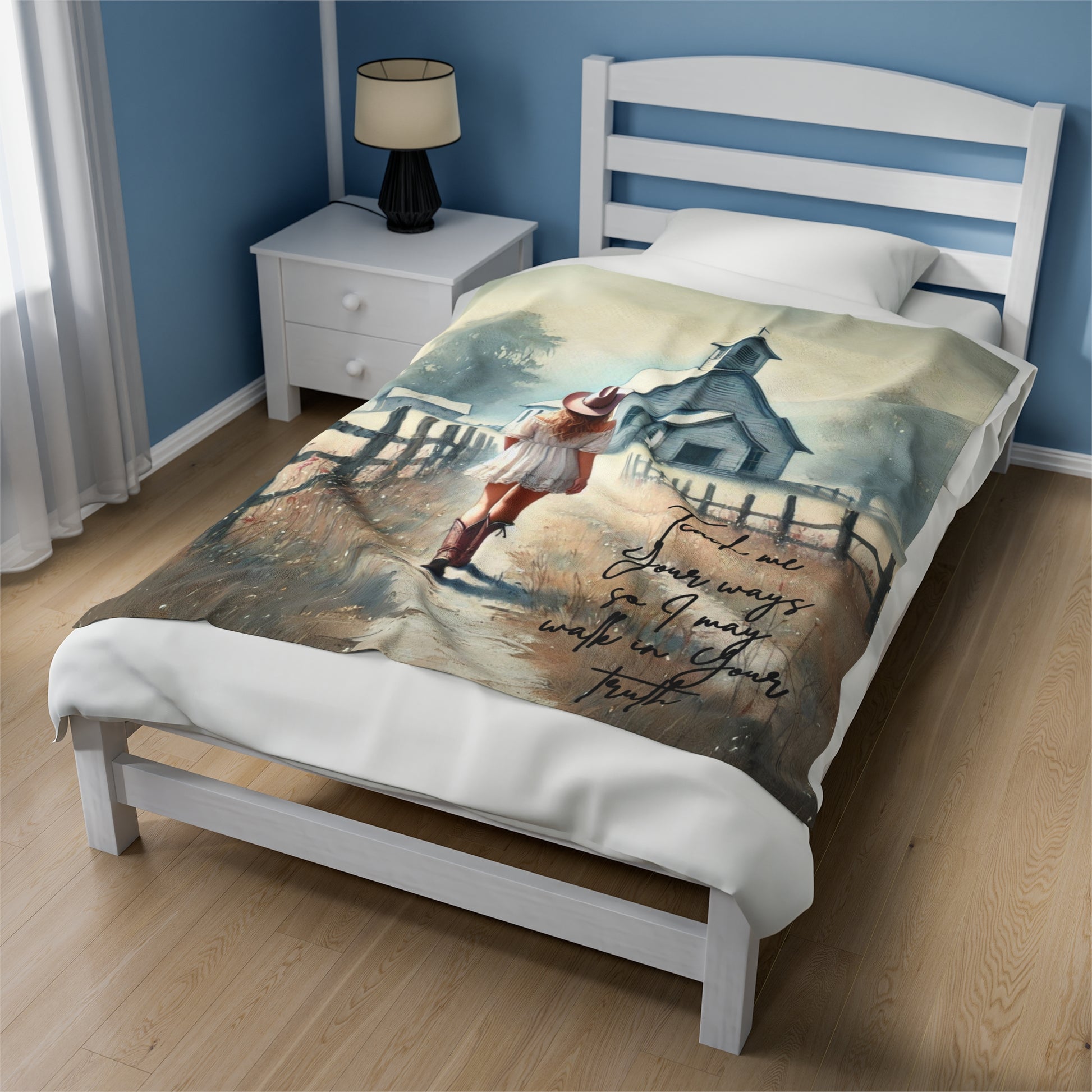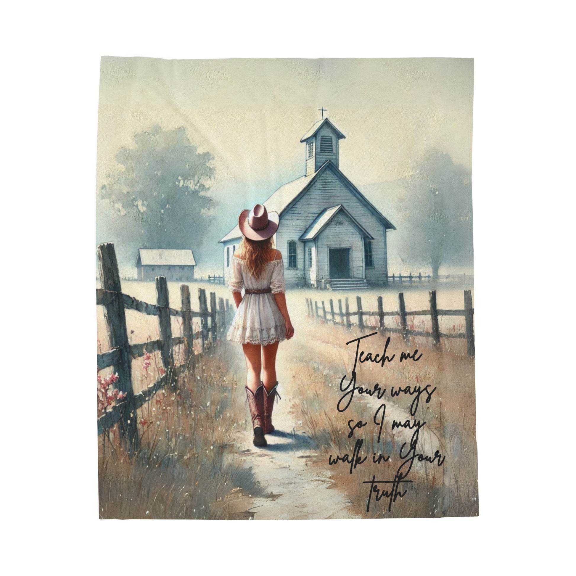 A velveteen plush blanket featuring the quote Teach Me Your Ways So I May Walk In Your Truth, with a design of a cowgirl walking down a dirt road to a church. It gives a cozy and inviting vibe, perfect for snuggling up on the couch or adding a touch of warmth to any room. Ideal for those who appreciate a rustic or country aesthetic, and relevant for churchgoers or fans of western themes.