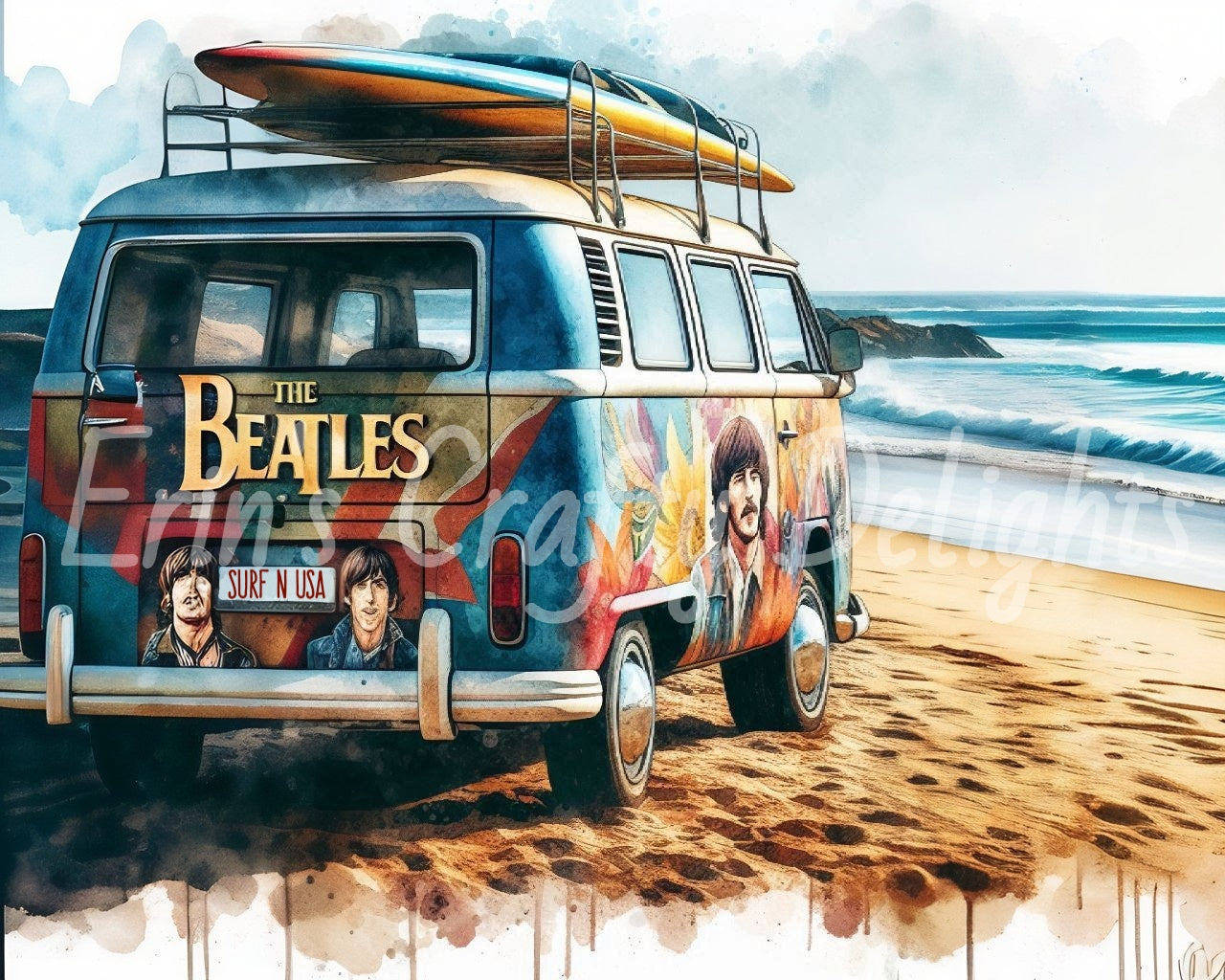 8x10" Landscape. Classic VW Bus painted in rainbow colors with a Beatles Mural is parked on the beach. Surf boards waiting to be out on the waves.