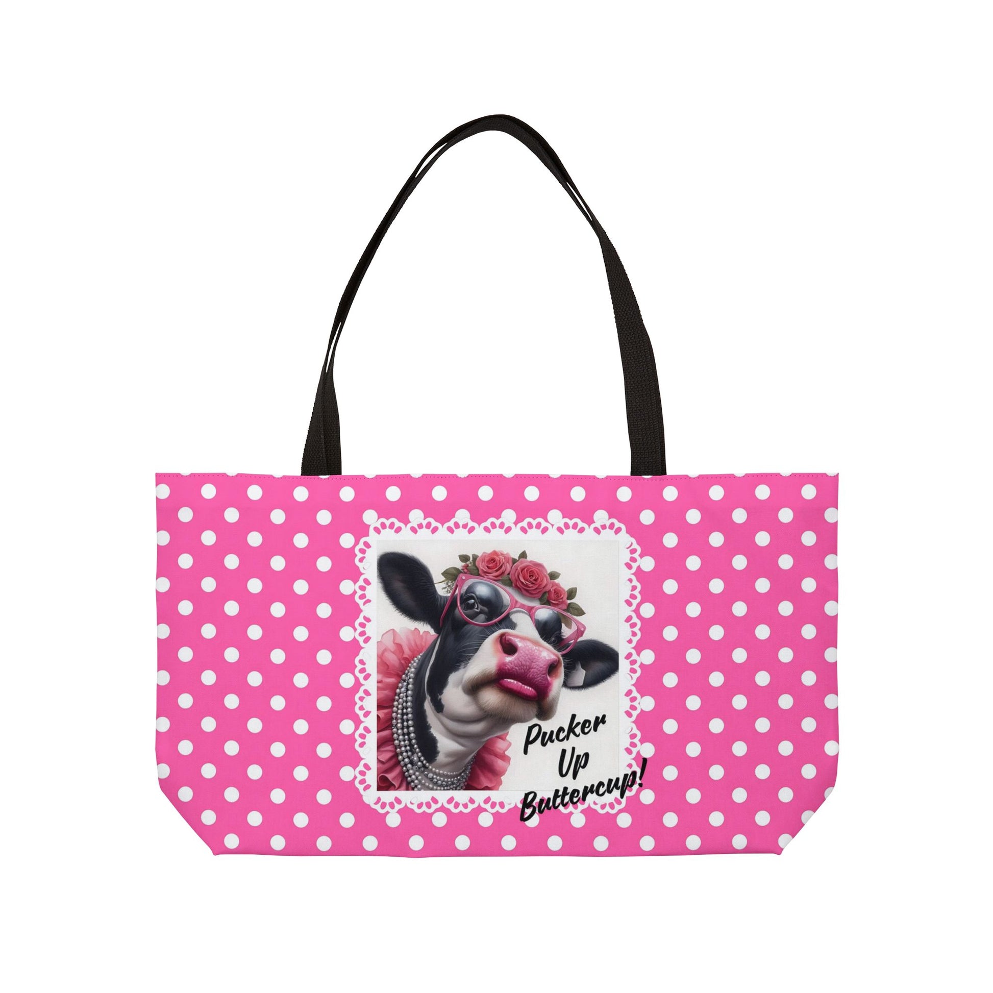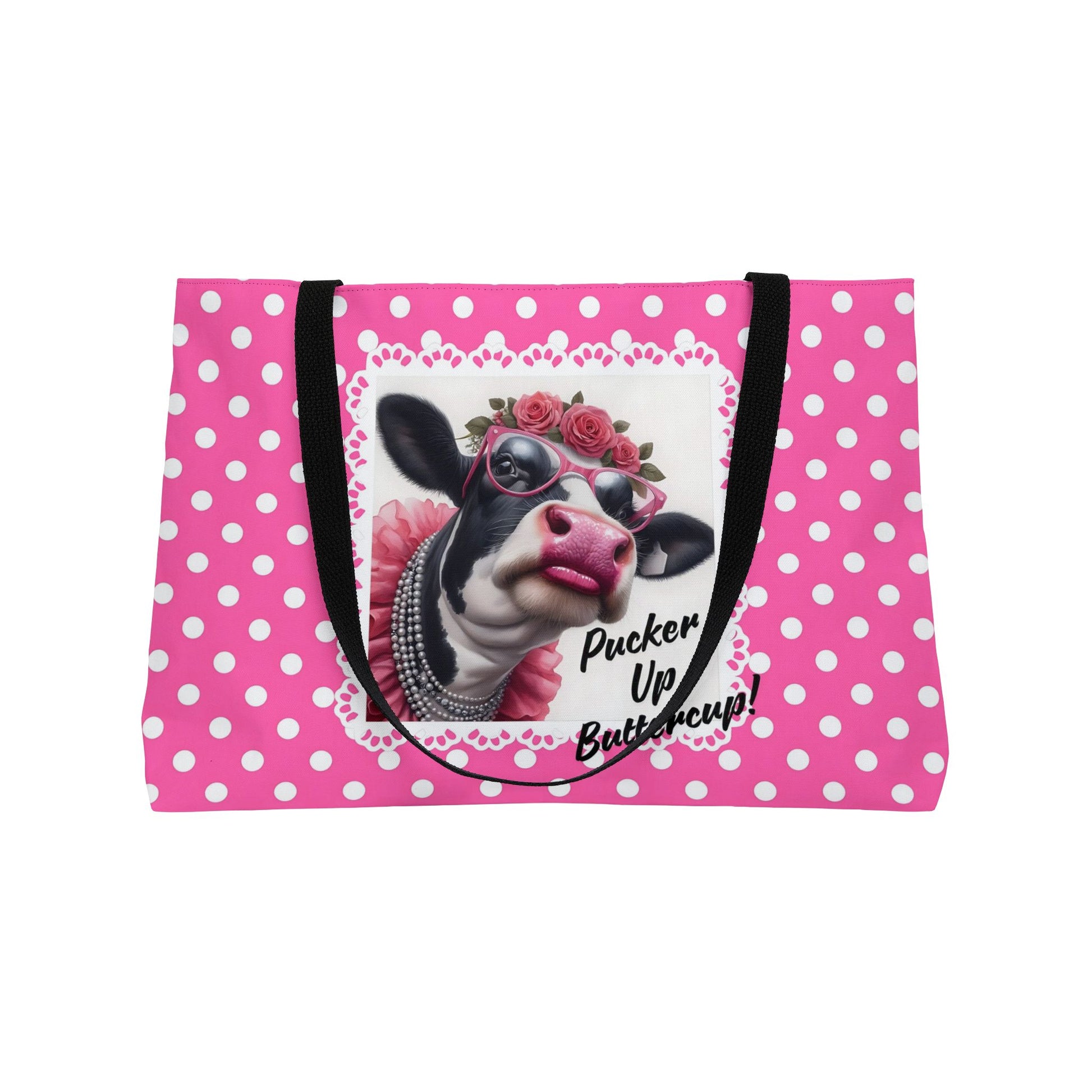 This tote bag features a whimsical design of a Holstein cow dressed up with the phrase 'Pucker Up Buttercup'. Perfect for adding a touch of fun to your everyday outfits. Ideal for animal lovers, farmers, and those who appreciate quirky accessories. Great for gifting on birthdays, holidays, and farm-themed events.
