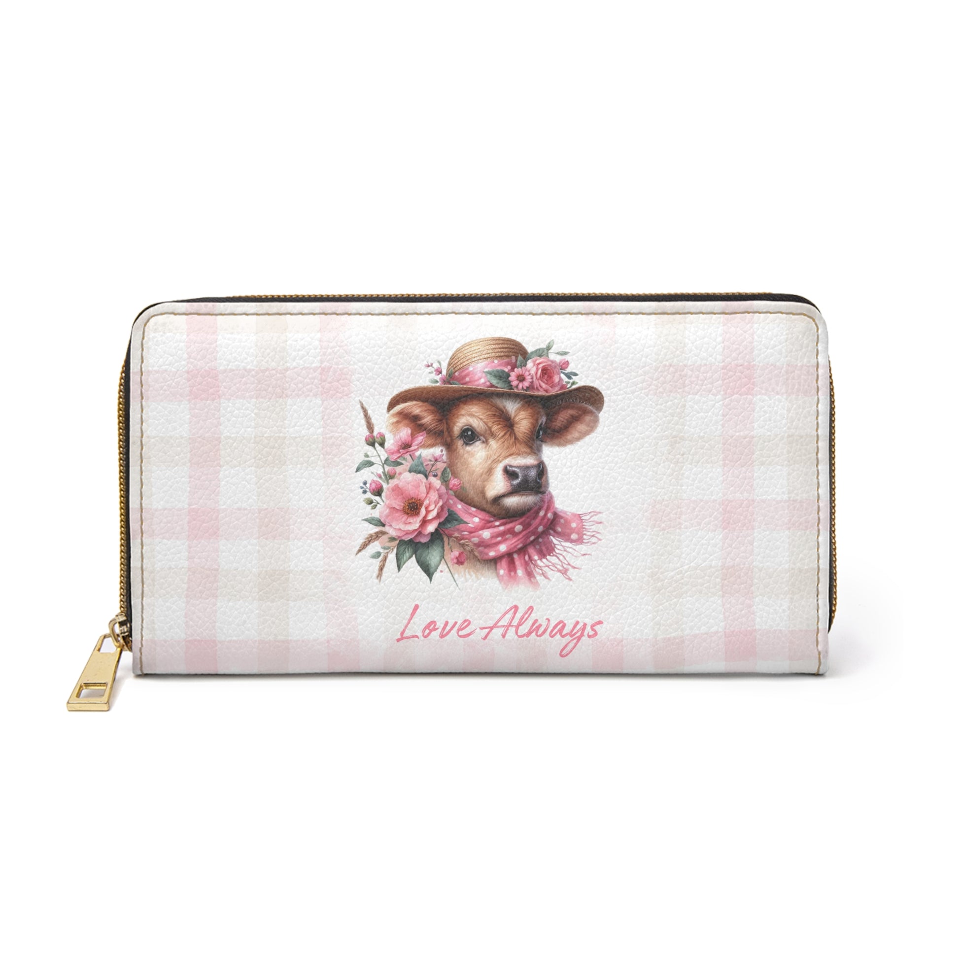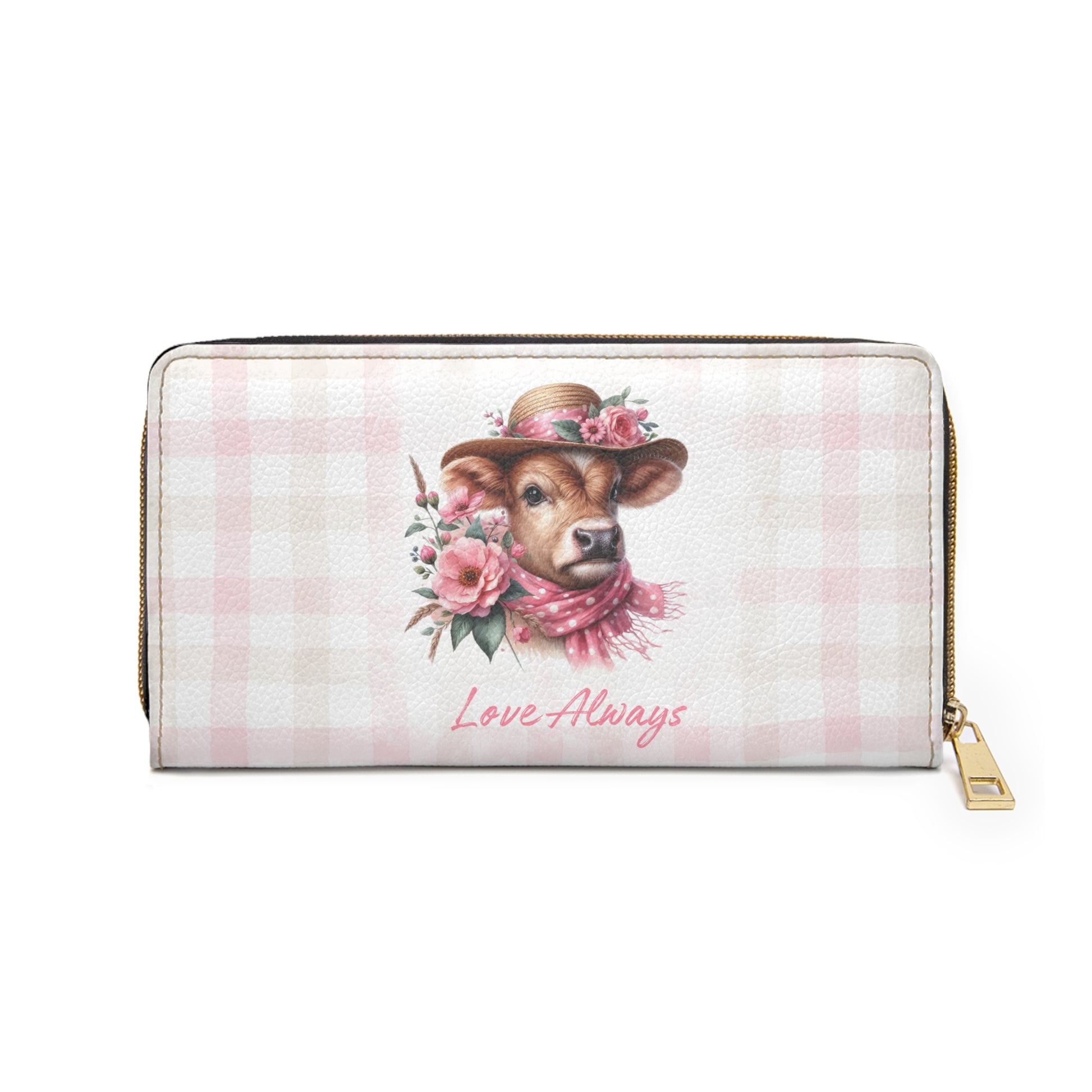 A stylish and sophisticated zipper wallet featuring a Love Always Dressed Up Cow Gingham Check design. Perfect for those who love fun and quirky accessories, this wallet is ideal for everyday use or special occasions.